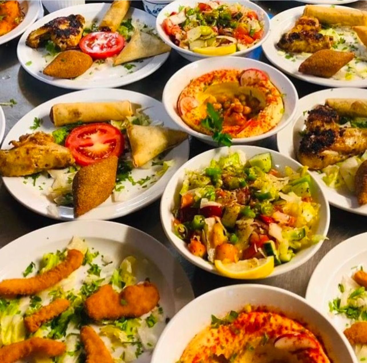 Platter of eight starters (Hommous,Falafel,salad,vine leaves,baba ghanouj,Meat filo pastry,grilled chicken wings, chicken samosa) Choose any main course from the menu.(Veg or Non Veg)